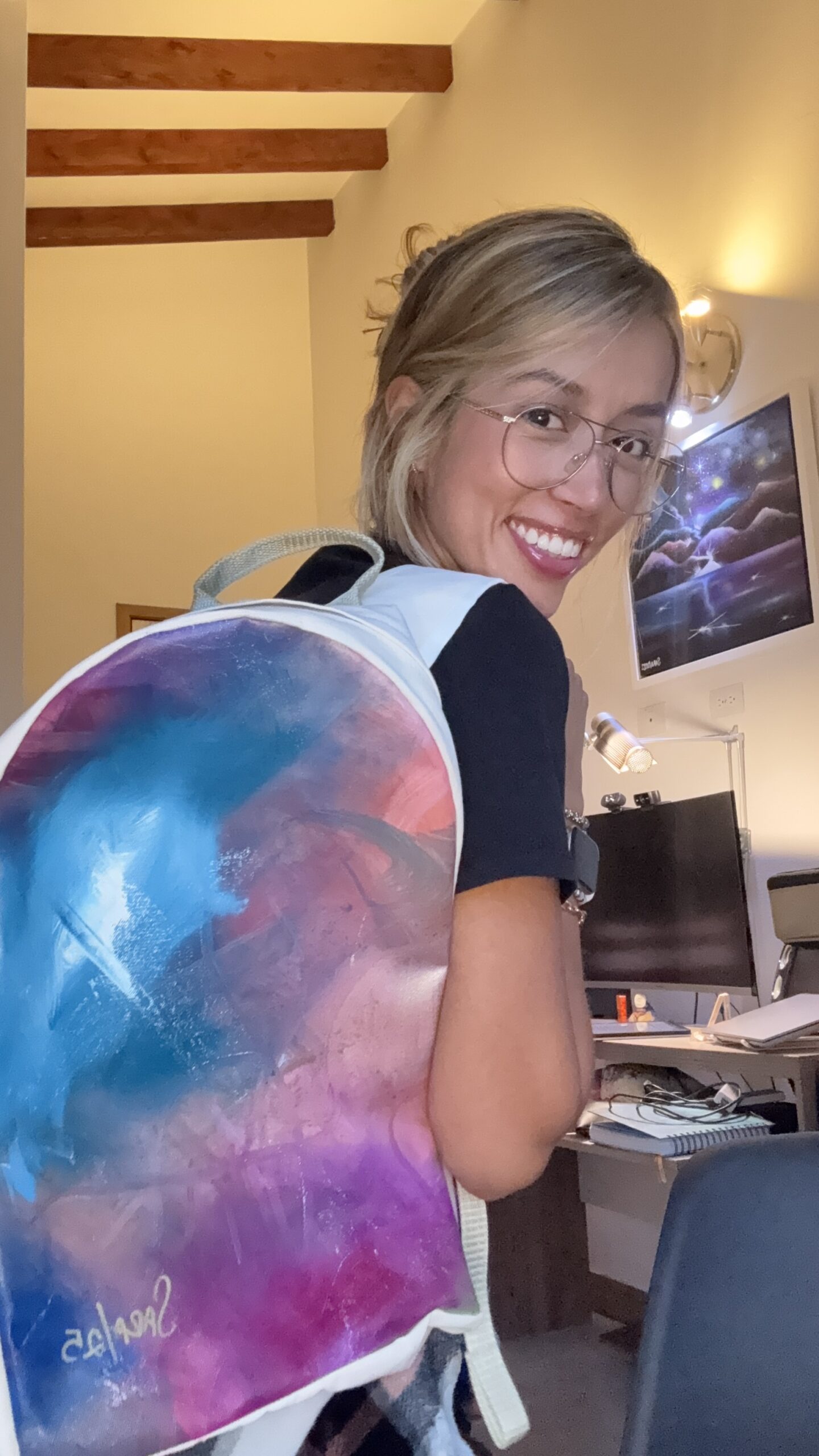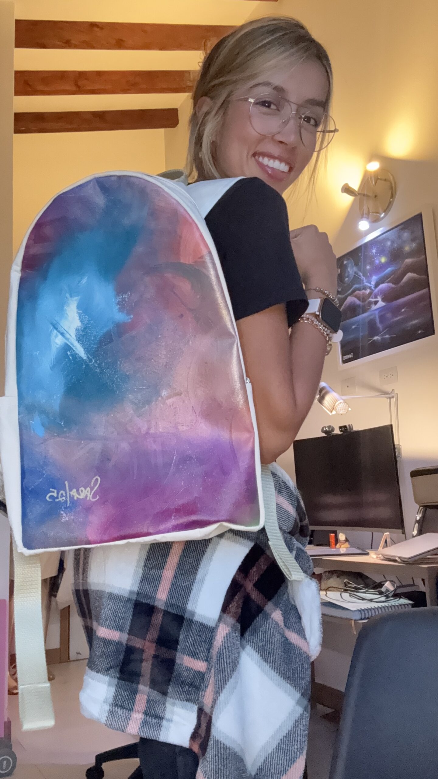 Cada mochila es 100% hecha a mano y pintada al óleo sobre lienzo, lo que la convierte en una creación única e irrepetible. Inspirada en la fuerza del color y la belleza del universo, transforma lo cotidiano en una experiencia cósmica.